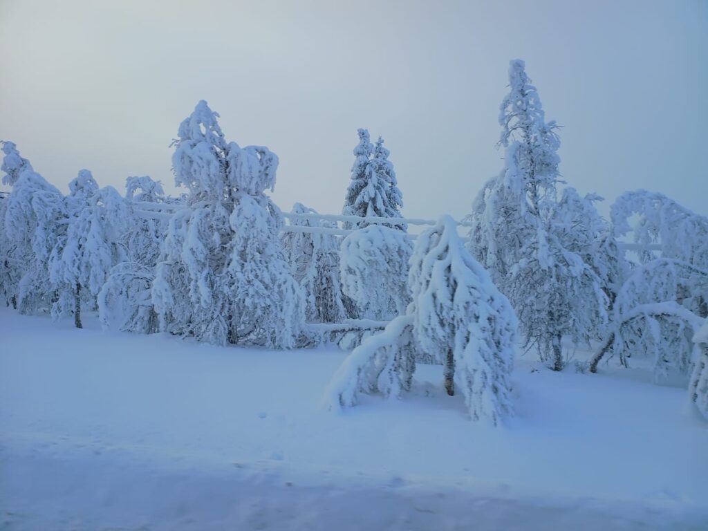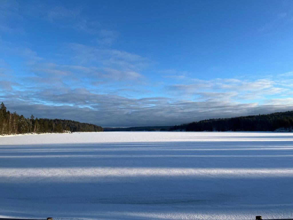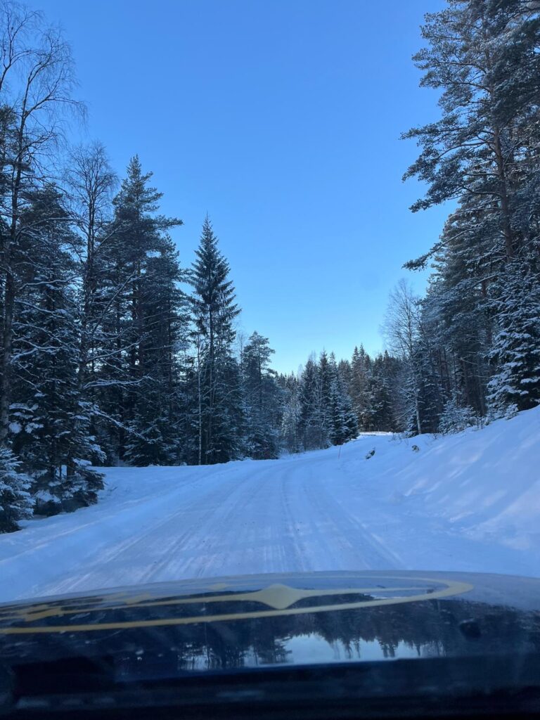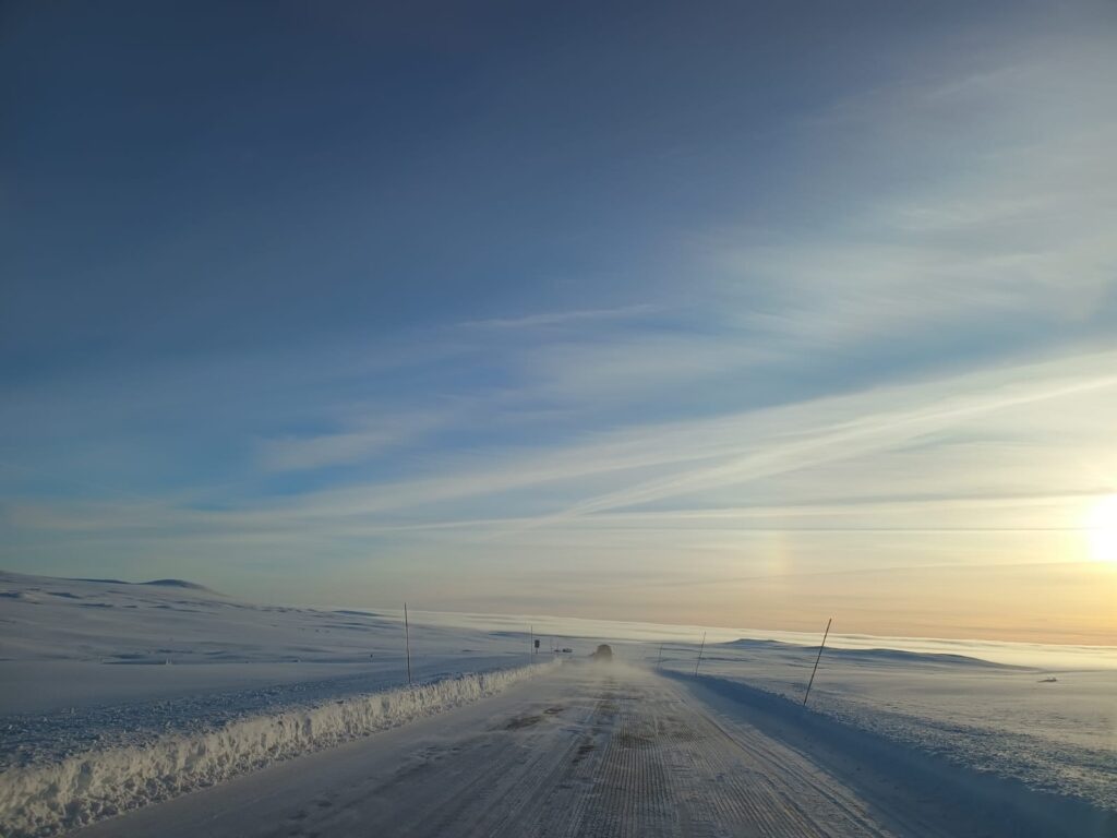 We also drove alone for a long time, which is wonderful because then you can drive at your own speed. Again, beautiful views, even though it’s very white. White roads, white shoulders, and white trees. and a beautifull sunset.